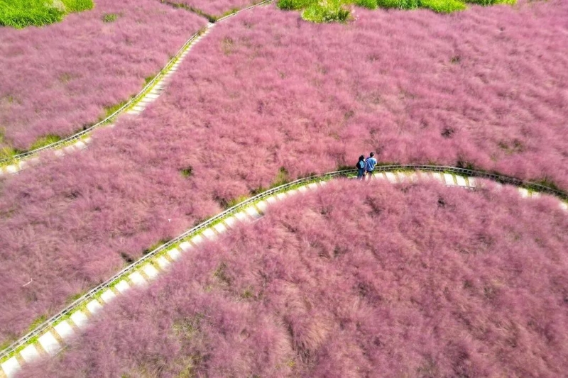 粉黛草根茎柔软 从远处看毛茸茸的 微风拂过 一片粉嘟嘟的海洋随风晃动 似棉花、似云朵 令人一眼就跌进童话仙境