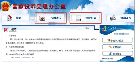第一步:访问国家信访局网站,在首页网上信访大厅点击“网上投诉请求”或“网上建议征集”,进入国家投诉受理办公室页面。